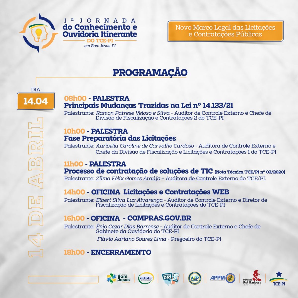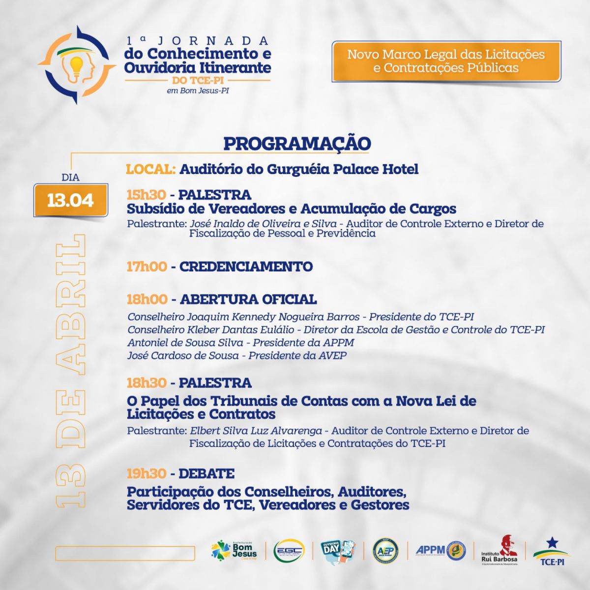 A Associação Piauiense de Municípios (APPM) e o Tribunal de Contas do Estado do Piauí (TCE-PI) convidam os Governantes municipais, servidores públicos e a sociedade em geral para participarem da I Jornada do Conhecimento do TCE-PI e o retorno do projeto “Ouvidoria Itinerante”, em Bom Jesus (PI), nos dias 13 e 14 de abril de 2023.