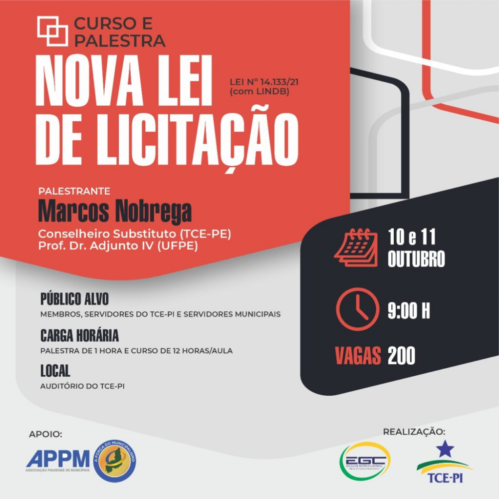 O Tribunal de Contas do Estado do Piauí (TCE-PI), por meio da Escola de Gestão e Controle (EGC), abriu inscrições para o curso: A Nova Lei de Licitação, Lei 14.133/21 (com LINDB), que será realizado nos dias 10 e 11 de outubro, no auditório do Tribunal. A qualificação é destinada para os membros e servidores do TCE-PI e os técnicos dos municípios, e será ministrado pelo Conselheiro Substituto do TCE-PE e professor da UFPE, Marcos Nóbrega.