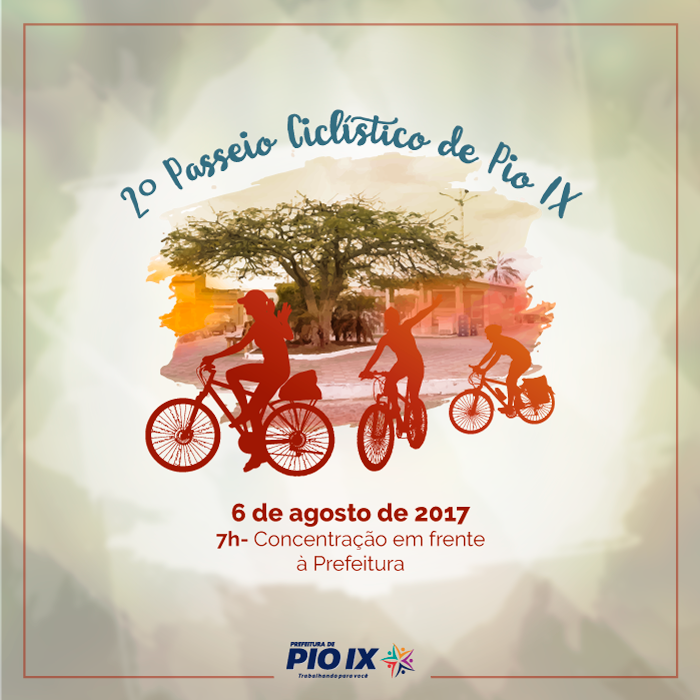 Seguindo a mesma ideia de incentivo a hábitos saudáveis, no domingo (6), acontece o 2º Passeio Ciclístico de Pio IX, com percurso de 5km e largada às 7h, em frente à sede da Prefeitura. Os interessados podem se inscrever até sexta-feira (04), na Casa da Juventude, no horário de 8h às 16h, portando documentos de identificação.