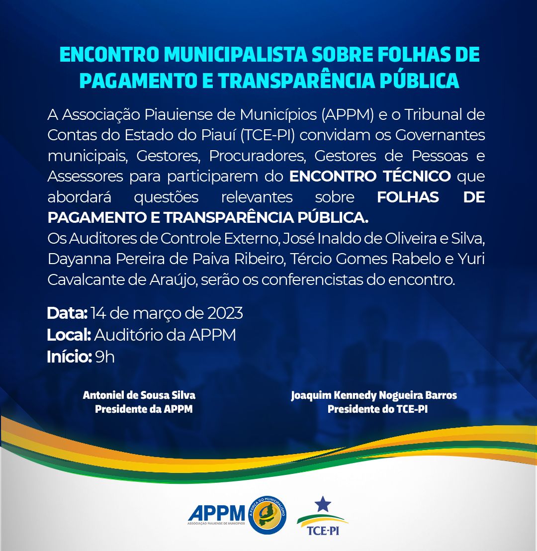 A Associação Piauiense de Municípios (APPM) e o Tribunal de Contas do Estado do Piauí (TCE-PI) convidam os Governantes municipais, Gestores, Procuradores, Gestores de Pessoas e assessores para participarem do ENCONTRO TÉCNICO que abordará questões relevantes sobre FOLHAS DE PAGAMENTO E TRANSPARÊNCIA PÚBLICA.