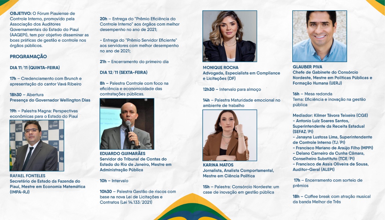O 4º Fórum Piauiense de Controle Interno contará, ainda, com cinco palestrantes renomados que abordarão temas relevantes para a administração pública, tais como avaliação de riscos, eficiência, economicidade, conformidade e inovação na gestão pública.