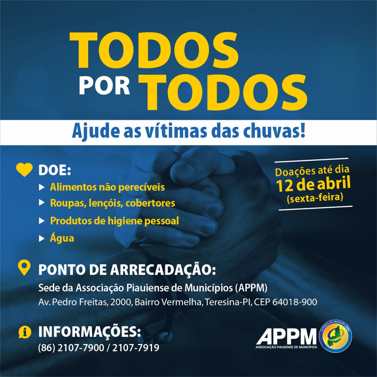 cadação de donativos para as vítimas das chuvas será feita até dia 12 de abril, próxima sexta-feira. Mais informações podem ser obtidas pelos telefones (86) 2107-7900 e 2107-7919.