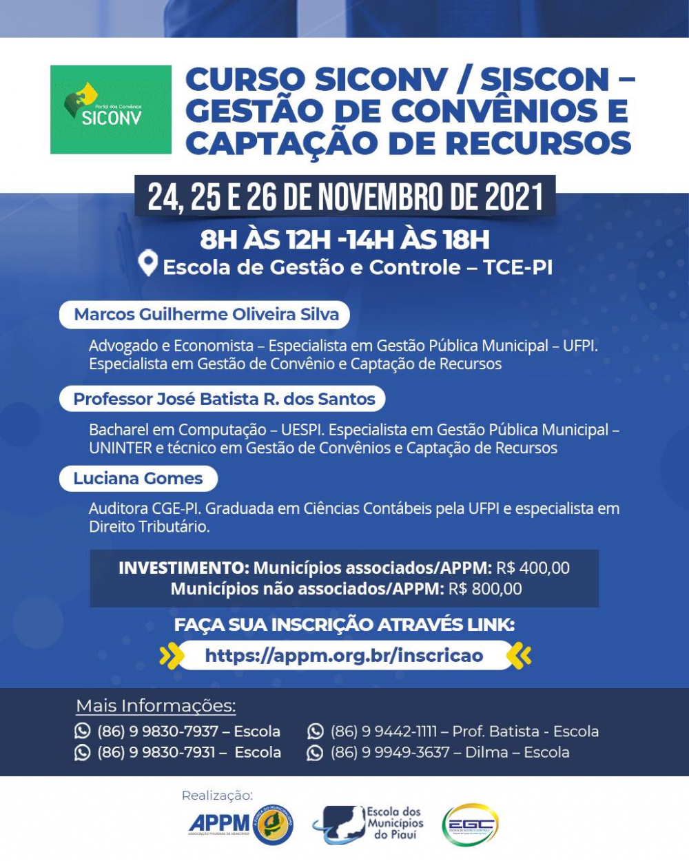 Nos dias 24, 25 e 26 de novembro, a APPM e a Escola dos Municípios, em parceria com a Escola de Gestão e Controle do TCE-PI, promovem o Curso de SICONV / SISCON - Gestão de Convênios e Captação de Recursos.