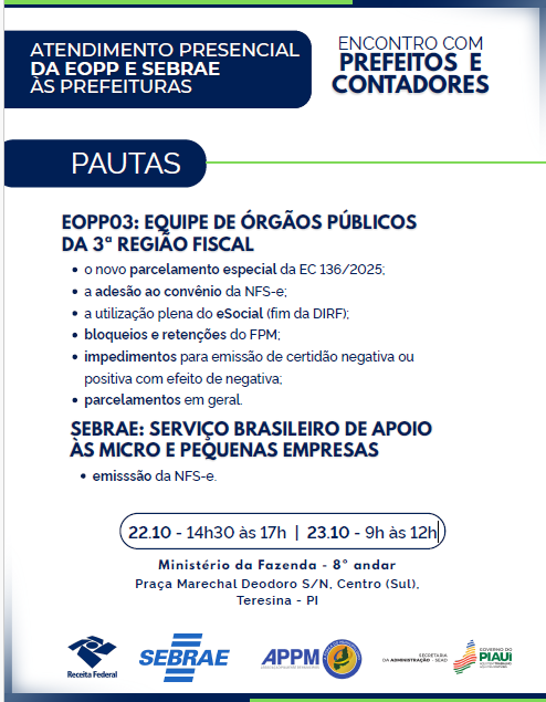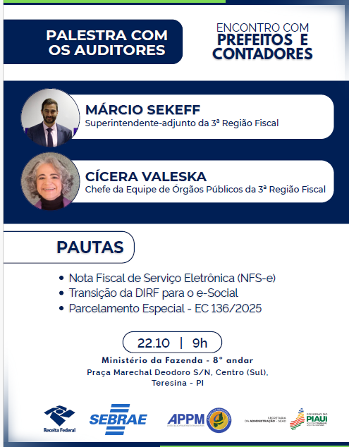 A Receita Federal do Brasil realiza, nos dias 22 e 23 de outubro, o Encontro com Prefeitos e Contadores, com o objetivo de promover o debate técnico e o compartilhamento de instruções sobre temas relevantes à gestão municipal.