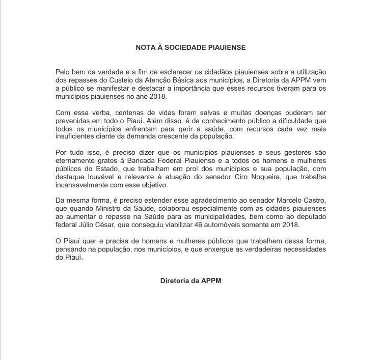 A Associação Piauiense de Municípios (APPM), através da sua Diretoria, e dispondo do compromisso e a responsabilidade de esclarecer a sociedade sobre a utilização dos repasses do Custeio da Atenção Básica aos municípios, emite a seguinte nota: