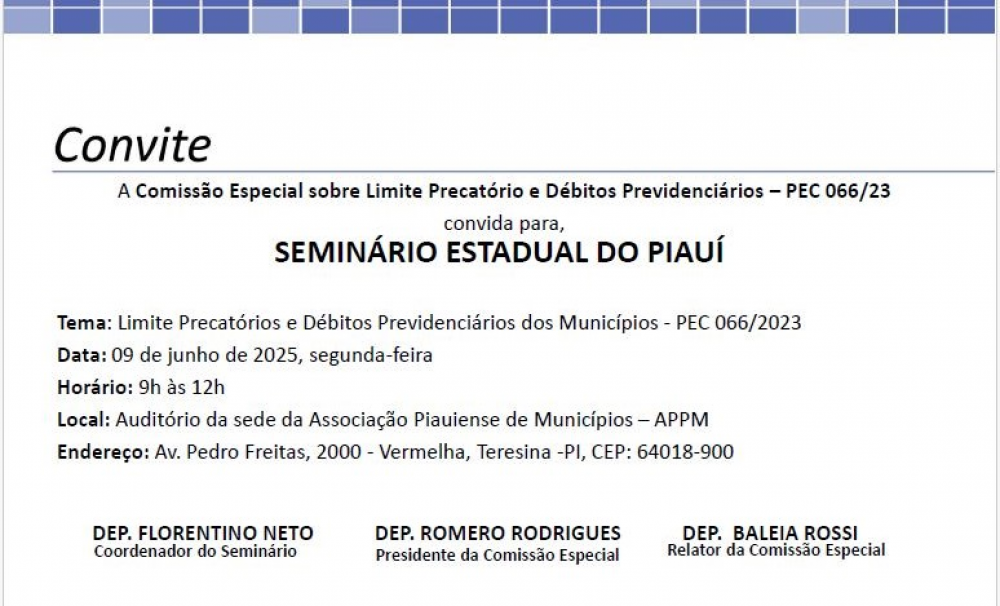 A Comissão Especial sobre Limite Precatórios e Débitos Previdenciários (PEC 066/23) da Câmara dos Deputados, em parceria com a Associação Piauiense de Municípios (APPM) realizam, na próxima segunda-feira (09), o Seminário Estadual do Piauí. O evento acontecerá na sede da APPM, em Teresina, com início às 8h55min.