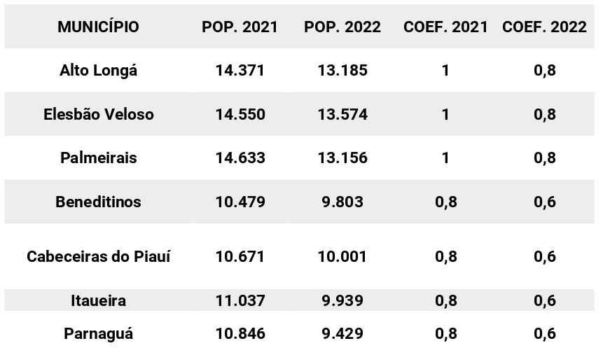 Com base apenas na estimativa, o TCU decidiu que, a partir de 01 de janeiro de 2023, os municípios de Alto Longá, Elesbão Veloso, Palmeirais, Beneditinos, Cabeceiras do Piauí, Itaueira e Parnaguá teriam seus coeficientes reduzidos, o que acarreta numa expressiva perda de recursos. A decisão considera a estimativa populacional que, segundo a APPM, foi equivocadamente apresentada de forma inconclusiva pelo Instituto Brasileiro de Geografia e Estatística – IBGE, em 28 de dezembro de 2022.
