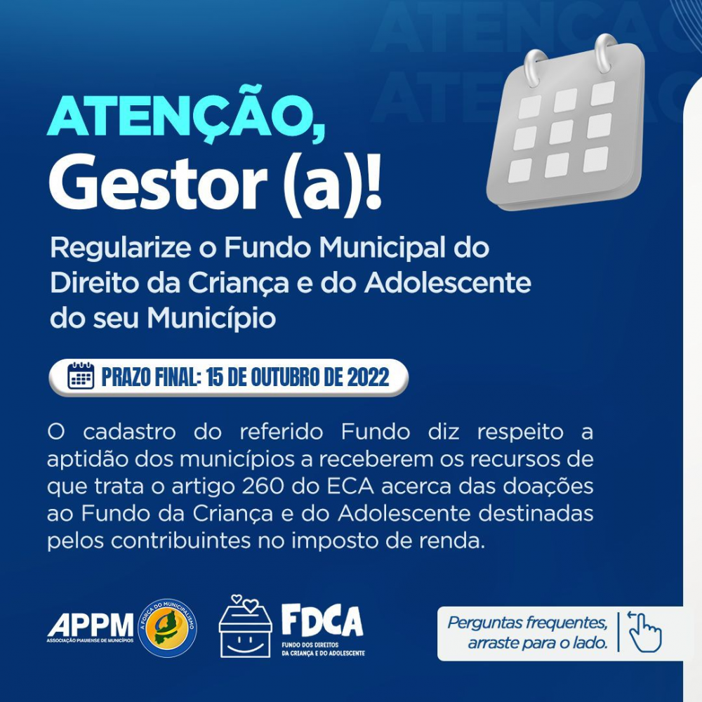 A Secretaria-Executiva do Conselho Nacional dos Direitos da Criança e do Adolescente informou ao Ministério Público do Estado do Piauí que muitos municípios encontram-se com inconsistências no cadastro do Fundo Municipal dos Direitos da Criança e do Adolescente e outros ainda não se cadastraram no referido Fundo.