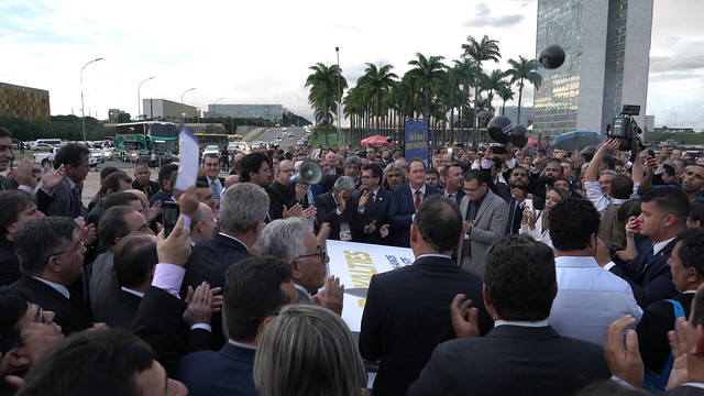Os participantes do ato cantaram o hino nacional e lançaram balões pretos simbolizando o luto dos municípios pela omissão do STF em relação à decisão. Além dos gestores municipais, o governador do Estado do Piauí, Wellington Dias, que encabeçou a tramitação e a aprovação do projeto no Congresso Nacional, na época, como senador federal, participou da manifestação.