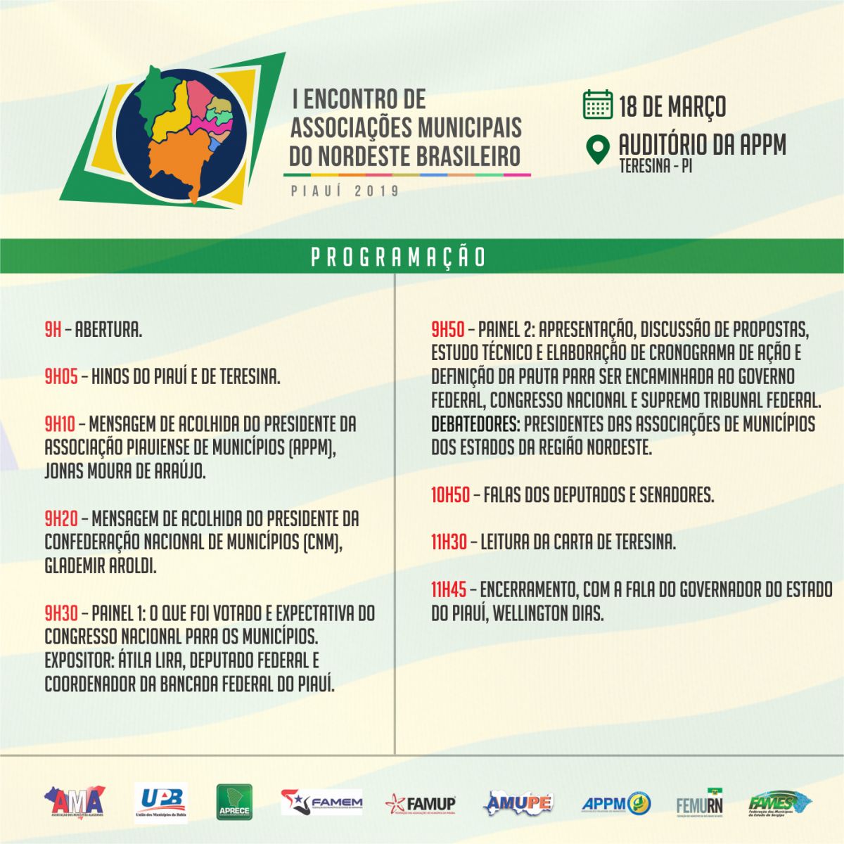 O Encontro é uma reunião técnica, que tem como objetivo reunir os presidentes de associações municipais dos nove estados nordestinos que elaborarão a Carta de Teresina – uma pauta de reivindicações municipalistas da região –, para ser entregue à Presidência da República, Congresso Nacional e ao Supremo Tribunal Federal (STF), durante a XXII Marcha a Brasília, que acontece de 8 a 11 de abril. Entre os temas a serem discutidos estão a Atualização dos Programas de Saúde, Cessão Onerosa, Royalties e 1% do FPM para o mês de setembro.