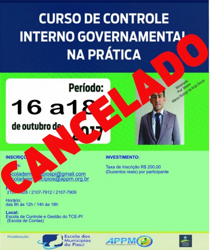 A Associação Piauiense de Municípios (APPM), através da Escola dos Municípios, informa que o curso de Controle Interno Governamental que aconteceria entre os dias 16 e 18 de outubro, foi cancelado em virtude do feriado do próximo dia 19, quando é comemorado o Dia do Piauí. Em breve um novo calendário de inscrições será divulgado pela instituição.