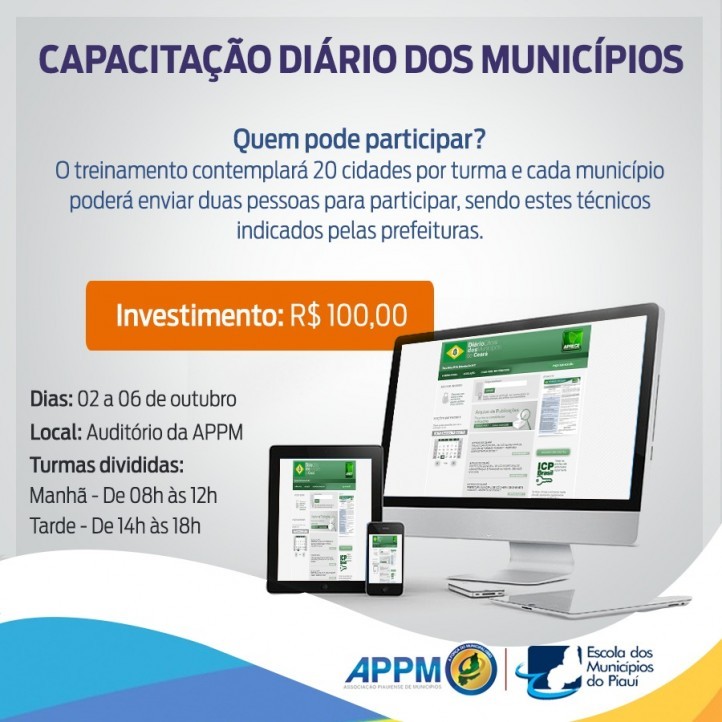 E com o objetivo de levar maior autonomia à administração municipal, a Associação irá realizar no período de 02 a 06 de outubro, no Auditório Joviano Maximino de Alencar, na sede da instituição, a capacitação do Diário dos Municípios, um treinamento preparado através da Escola dos Municípios para os técnicos indicados pelas prefeituras, que serão responsáveis pela alimentação da plataforma.