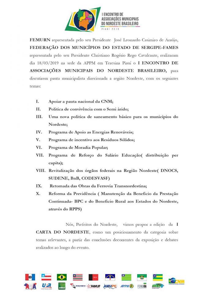 Os presidentes das nove associações e federações municipalistas da região Nordeste formularam a “Carta dos Prefeitos do Nordeste”.