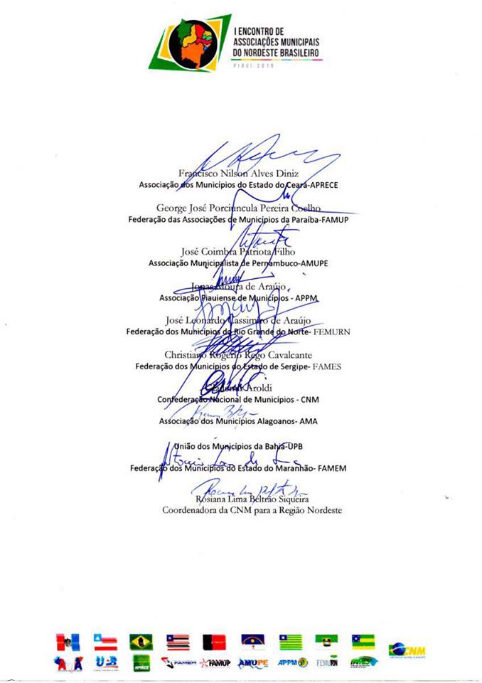 Subscreveram o documento, além do presidente da APPM, Jonas Moura Araújo, o presidente da CNM, Glademir Aroldi e os presidentes da Amupe, José Patriota; da AMA, Hugo Wanderley; da UPB, Eures Ribeiro Pereira; da Aprece, Francisco Alves Diniz; da Famem, Erlanio Furtado Luna Xavier; da Famup, George Pereira Coelho; da Femurn, José Leonardo Cassimiro de Araújo; e da Fames, Christiano Rogério Rego Cavalcante; além da coordenadora da CNM para o Nordeste, Rosiana Siqueira.