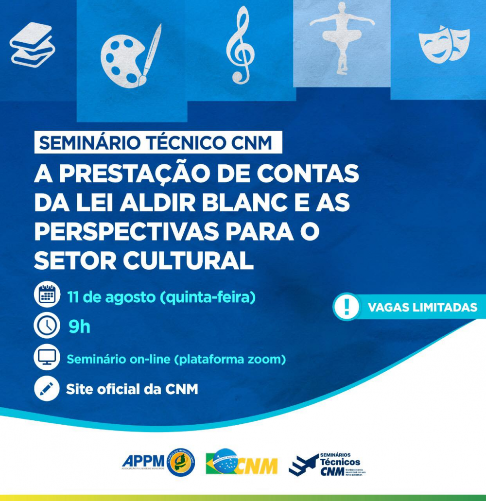 A Confederação Nacional de Municípios (CNM) estará ofertando, no dia 11 de agosto, a partir das 9h, um seminário sobre a Prestação de Contas da Lei Aldir Blanc e as perspectivas para o setor cultural.