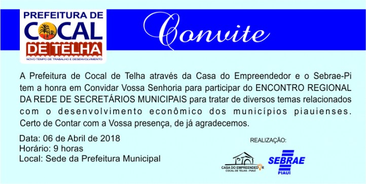 Nesta sexta-feira, 6 de Abril, em Cocal de Telha um encontro da Rede de Secretários Municipais de Desenvolvimento Econômico dos Municipais Piauienses. O evento é organizado pelo SEBRAE – Agência de Piripiri e deverá contar com presença de secretários municipais de agricultura, educação e meio ambiente de vários municípios piauienses.