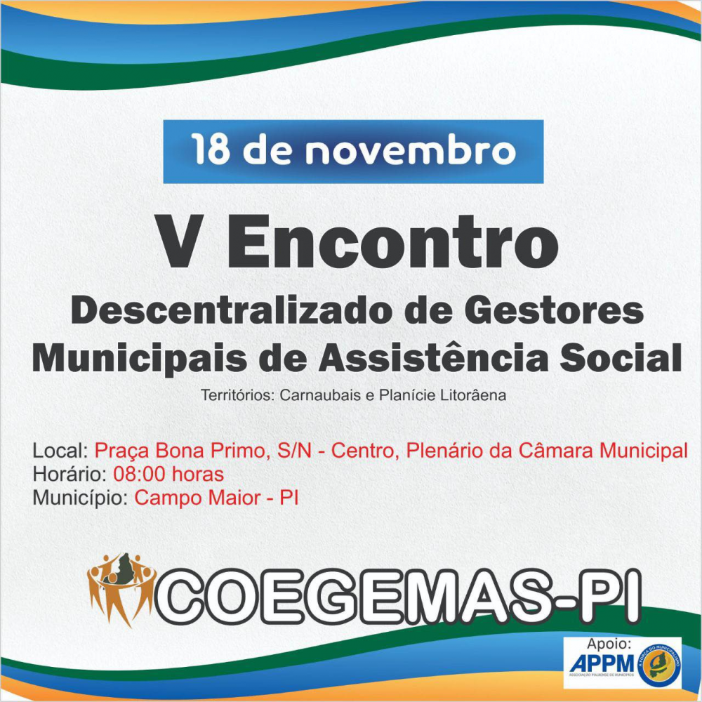 O Colegiado Estadual de Gestores Municipais de Assistência Social (COEGEMAS-PI) realizará, na próxima sexta-feira (18), na cidade de Campo Maior, o Encontro Estadual Descentralizado com Municípios dos Territórios dos Carnaubais e Planície Litorânea.