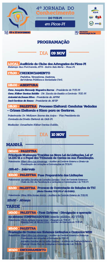 A Jornada prossegue na sexta-feira, 10 de novembro, a partir da 8h, com a palestra: “Principais mudanças trazidas pela Nova Lei de Licitações (Lei nº 14.133/21) e o papel dos Tribunais de Contas na sua fiscalização”, ministrada pelo auditor de controle externo Elbert Alvarenga, diretor de Fiscalização de Licitações e Contratos do TCE-PI.