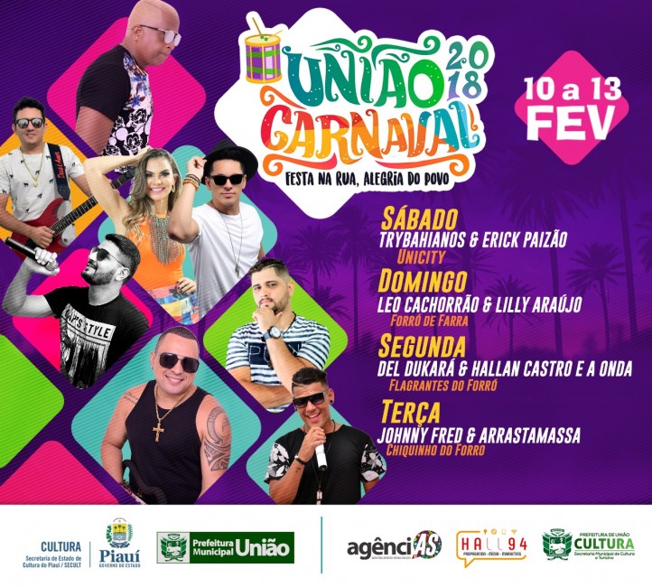 Após reunião com membros da Comissão do Carnaval 2018, a Prefeitura Municipal de União divulga a programação oficial para o período carnavalesco, que acontece entre os dias 10 e 13 de fevereiro deste ano. Atrações locais e nomes como: Trybahianos, Léo Cachorrão, Lili Araújo, Erik Paizão, A Onda e outros fazem parte da lista.