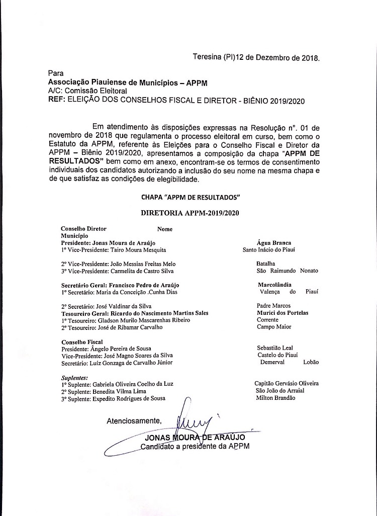 O presidente da APPM, Gil Carlos, que desde as primeiras reuniões defendeu o nome de Jonas Moura para ser o seu sucessor, esclarece que a APPM precisa estar sempre unida, representativa e atuante nas causas dos municípios. “O Jonas é um gestor arrojado, que faz uma gestão exemplar em Água Branca, e com certeza trará o seu conhecimento como gestor público para somar à APPM. É imprescindível à instituição municipalista piauiense ter um presidente agregador, que trabalhe firme pelos municípios e seus gestores. Parabenizamos todos os colegas que participaram e se envolveram neste processo democrático, desejando que a nova diretoria faça uma boa administração junto a nossa Associação”, pontua.