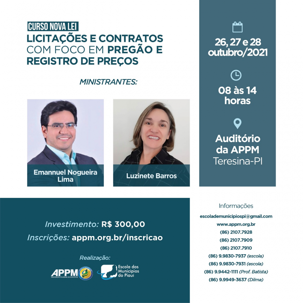 A capacitação acontece do dia 26 a 28 de outubro, no auditório da APPM, e terá como palestrantes o advogado com experiência na área de Direito, com ênfase em Direito Administrativo, Civil e Processo Civil; Professor de Pós- Graduação em Direito Administrativo e Direito Constitucional da Escola do Legislativo e da Faculdade Ademar Rosado; Especialista em Controle na Administração Publica pela UFPI e TCE-PI; Ministrante do Curso de Licitações e Contratos/ Pregão da Escola de Municípios do Piauí, Emannuel Nogueira Lima; e Luzinete Barros, advogada, professora, consultora em Licitações e Contratos Administrativos; Coordenadora de Licitações e Contratos; Presidente da Comissão de Licitação; Gerente de Pregões e Doutoranda em Direito Administrativo.