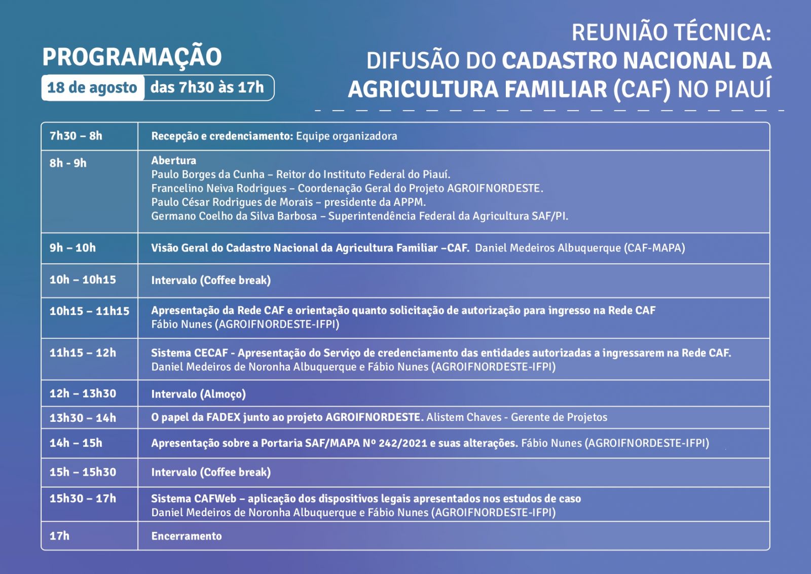 A programação do Seminário conta com exposições sobre os seguintes temas: Visão Geral do Cadastro Nacional da Agricultura Familiar (CAF); Apresentação da Rede CAF e orientação quanto solicitação de autorização para ingresso na Rede CAF; Apresentação do serviço de credenciamento das entidades autorizadas a ingressarem na Rede CAF; Apresentação da Portaria SAF/MAPA Nº 242/2021 e suas alterações; e Sistema CAFWeb – aplicação dos dispositivos legais apresentados nos estudos de caso.