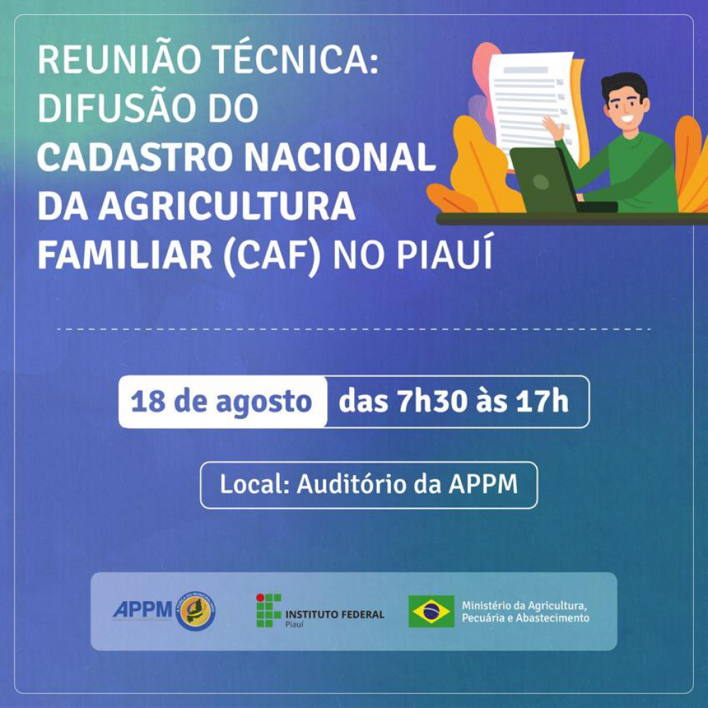 A Secretaria de Agricultura Familiar (SAF/MAPA), em parceria com a Associação Piauiense de Municípios (APPM) e o Instituto Federal do Piauí (IFPI), realiza, dia 18 de agosto, das 7h30 às 17h, uma reunião técnica com os Secretários de Agricultura dos Municípios do Piauí. O encontro acontecerá no auditório da APPM e tem como objetivo divulgar informações acerca do Cadastro Nacional da Agricultura Familiar (CAF).