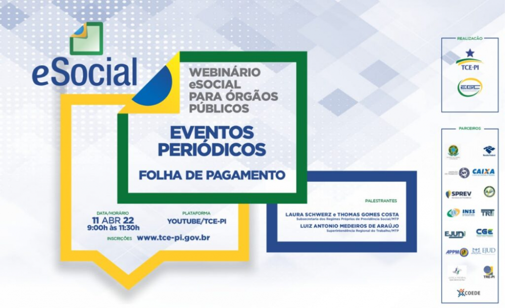 O Tribunal de Contas do Estado do Piauí (TCE-PI), por meio da Escola de Gestão e Controle (EGC), realizará a 2ª edição do Webinário eSocial para Órgãos Públicos, no dia 11 de abril, às 09h, pelo canal do YouTube, com o tema Eventos Periódicos – Folha de Pagamento.