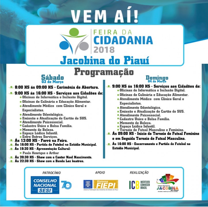 Neste final de semana, próximos dias 3 e 4 de março, a população do município de Jacobina do Piauí será contemplada com diversos serviços ofertados gratuitamente através da Feira da Cidadania 2018. O evento será realizado pelo Instituto Conhecer Brasil, com patrocínio do SESI e apoio da Prefeitura Municipal de Jacobina Piauí.