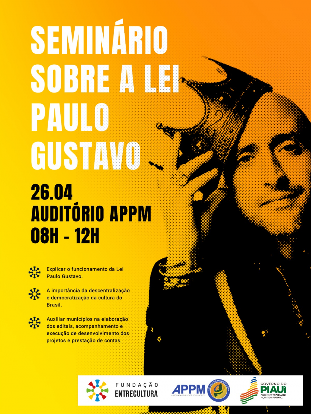 Na parte da manhã, das 08 às 12h, acontecerá um Seminário sobre a Lei Paulo Gustavo Piauí, que tem como objetivo explicar aos presentes o funcionamento da referida Lei, explanar a importância da descentralização e democratização da cultura no Brasil e auxiliar os Municípios na elaboração dos editais, desenvolvimento dos projetos e prestação de contas, sendo disponibilizada uma Cartinha didática sobre a Lei.