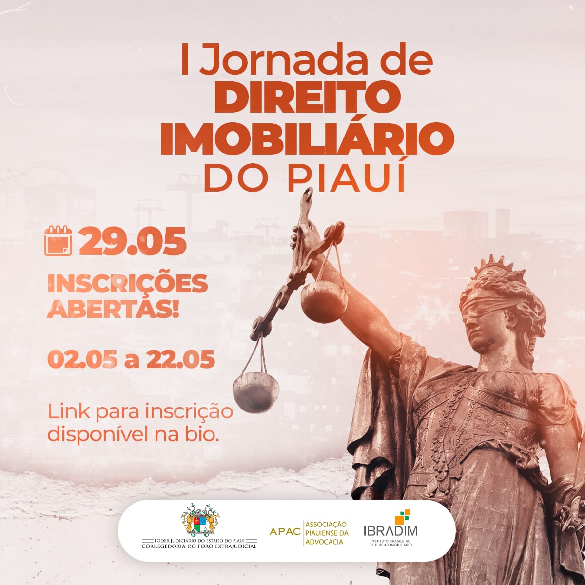 Este é um evento gratuito realizado pela Corregedoria do Foro Extrajudicial do Tribunal de Justiça do Piauí, em parceria com o Instituto Brasileiro de Direito Imobiliário (IBRADIM) e a Associação Piauiense da Advocacia (APAC), e acontece dia 29 de maio, das 8h às 18h, no auditório do prédio histórico do Tribunal de Justiça do Piauí. As inscrições estão abertas entre os dias 02.05 e 22.05, e podem ser realizadas clicando aqui.