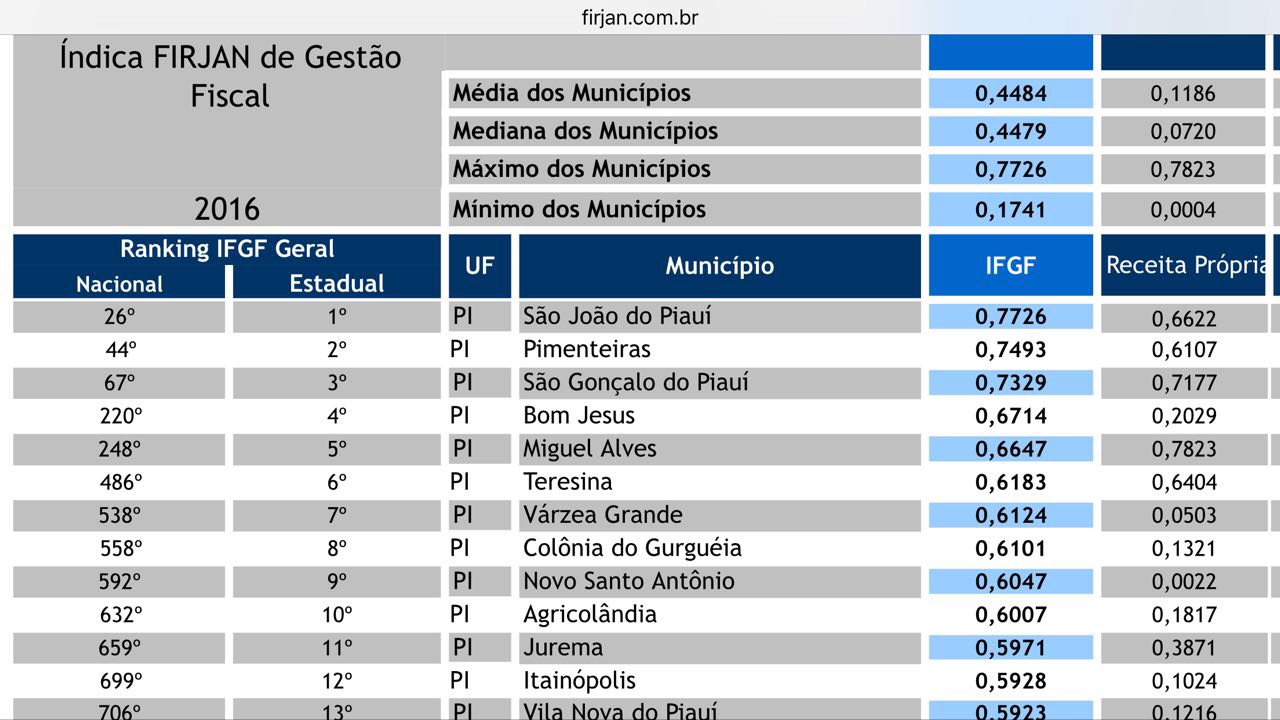 Segundo Índice de Gestão Fiscal da Federação da Indústria do Estado do Rio de Janeiro (FIRJAN), divulgado nesta quinta-feira (10), 86% das prefeituras brasileiras estão em situação crítica. No Piauí, o município de São João do Piauí obteve o melhor índice, ficando em 26º lugar em relação aos demais municípios do país.