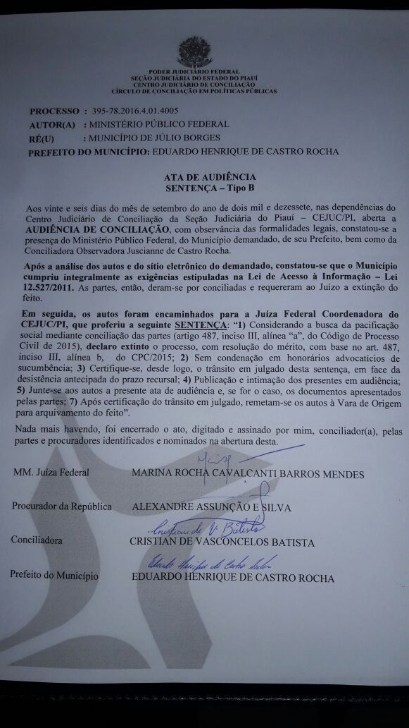 O prefeito de Júlio Borges, Eduardo Henrique, participou na manhã desta terça-feira (26) do segundo Mutirão da Transparência, uma audiência de conciliação que trata de exigências legais referente ao Portal da Transparência. Na reunião, que aconteceu na Justiça Federal, foi constatado que o município de Júlio Borges cumpriu integralmente as obrigações estipuladas na Lei de Acesso à Informação nº 12.527/2011, que regulamenta o direito, previsto na Constituição, de qualquer pessoa solicitar e receber dos órgãos e entidades públicos, de todos os entes e Poderes, informações públicas por eles produzidas ou custodiadas.