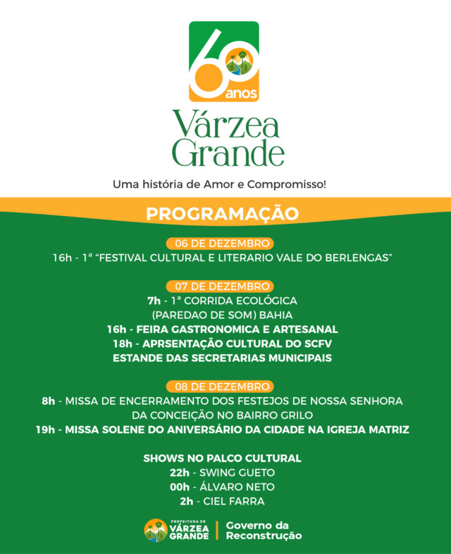 Município de Várzea Grande completará 60 anos de emancipação política, e em comemoração, a prefeitura está organizando uma vasta programação com atrações musicais e um encontro de paredões. Os shows acontecerão na praça de eventos da cidade.