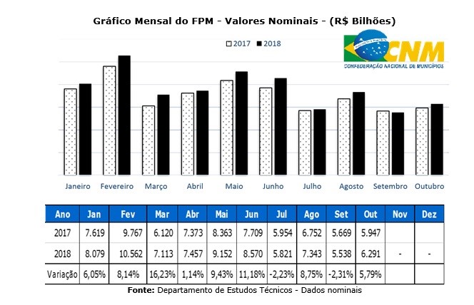No entanto, mesmo com a retração mostrada acima, quando se considera o valor do mês, o Fundo de outubro teve crescimento de 5,79%. No mesmo mês do ano passado, os Municípios partilharam R$ 5,9 bilhões. A soma dos três repasses deste ano foi de R$ 6,2 bilhões. “Com valores deflacionados, evidencia-se um comportamento positivo ao longo do ano, com os meses de fevereiro, maio e junho representando as melhores taxas de crescimento até então, comparado com os mesmos resultados de 2017”, mostra o levantamento.