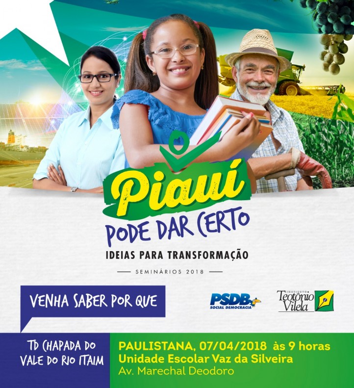 Paulistana, cidade situada a 460 km de Teresina, sediará no próximo sábado, 07 de abril, o Seminário “O Piauí pode dar certo: ideias para transformação”, promovido pelo o Instituto Teotônio Vilela (ITV) e o Partido da Social Democracia Brasileira (PSDB).
