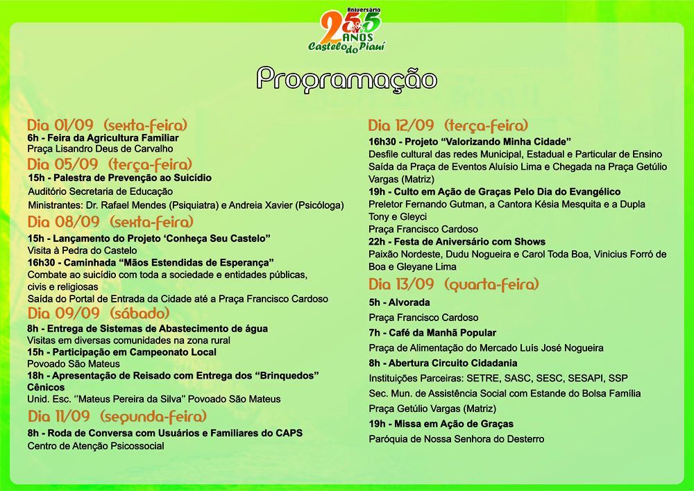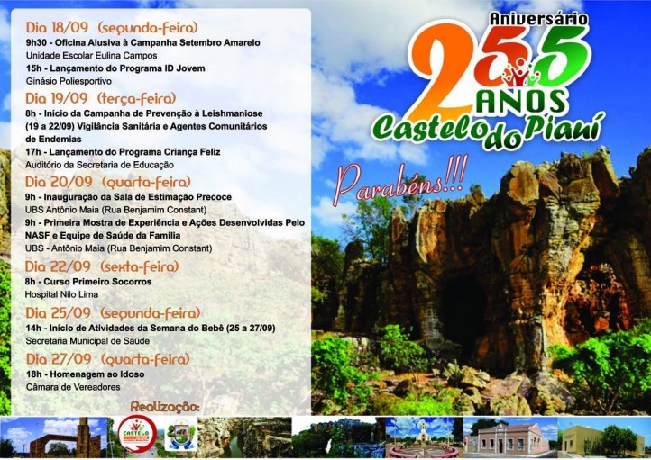 A Prefeitura de Castelo do Piauí, em comemoração aos seus 255 anos, está promovendo uma programação especial ao longo deste mês. As atividades tiveram início no dia (01/09), com a Feira da Agricultura Familiar e segue até o dia (27/09), com a homenagem aos idosos, na Câmara dos Vereadores da cidade.