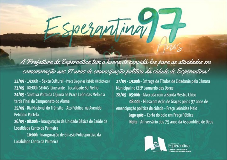 A prefeitura de Esperantina, divulgou a programação das atividades alusivas aos 97 anos de emancipação política da cidade.