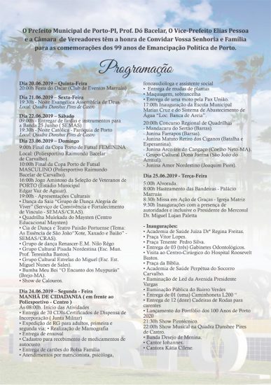 A Prefeitura Municipal de Porto divulgou a programação oficial do Aniversário de 99 anos de Emancipação Política da cidade e da Semana Junina de Porto. A Programação oficial tem início dia 20, com a Festa do Oscar e segue até dia 25 de junho.