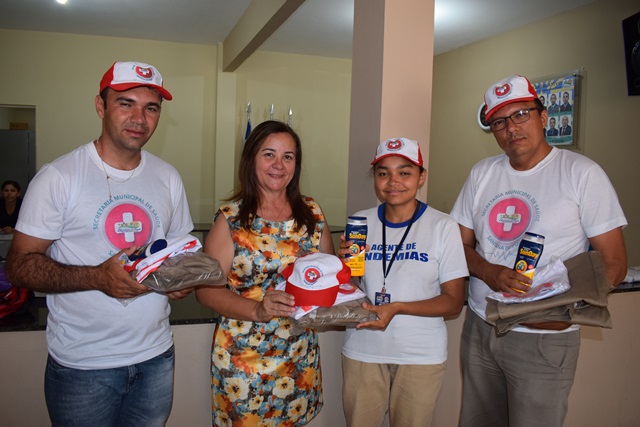 A entrega dos fardamentos e materiais contemplou os Agentes Comunitários de Saúde (ACS), servidores da Vigilância Sanitária, da Vigilância Epidemiológica, do Programa Saúde da Família, do Núcleo de Apoio à Saúde da Família (NASF) e do setor Administrativo da Secretaria Municipal de Saúde.