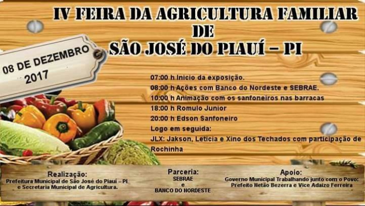 A prefeitura de São José do Piauí, juntamente com a secretaria municipal de Agricultura, realizará a "IV Feira da Agricultura Familiar" no dia 8 de dezembro no município.