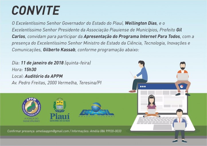 A Associação Piauiense de Municípios (APPM) recebe nesta quinta-feira (11), a partir das 15h30, a visita do Ministro da Ciência, Tecnologia, Inovações e Comunicações, Gilberto Kassab, para apresentação do Programa Internet Para Todos, uma ação que visa levar conectividade aos equipamentos públicos dos municípios, além de apoiar a implementação da Política de Inovação Educação Conectada.