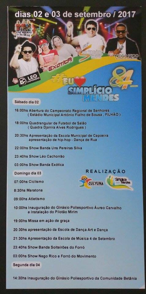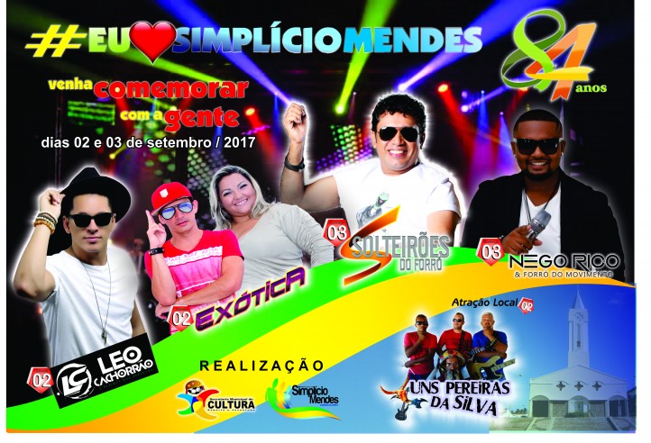 A cidade de Simplício Mendes comemora no próximo dia 04 de setembro, 84 anos de Emancipação Política, e para festejar, o Prefeito Municipal Dr. Heli de Araújo Moura Fé, o Vice Prefeito Áureo de Carvalho Paulo e Equipe de Governo convidam todas as familias para participarem da programação festiva.
