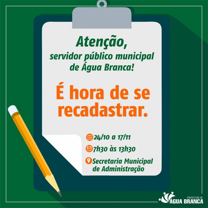 A Prefeitura de Água Branca está realizando o recadastramento de todos os servidores públicos efetivos, ativos, inativos, pensionistas, comissionados, contratados e prestadores de serviço. O recadastramento deve ser feito até o dia 17 de novembro, das 7h30 às 13h30, na Sala da Cidadania da Secretaria Municipal de Administração.