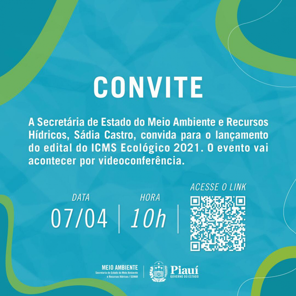 A Secretaria de Estado do Meio Ambiente e Recursos Hídricos (Semar) irá lançar, nesta segunda-feira (12), às 10h, o edital do Imposto sobre Circulação de Mercadorias e Serviços (ICMS) Ecológico 2021. O evento será realizado através de videoconferência com transmissão pelo Youtube, reunindo prefeitos e secretários de meio ambiente dos Municípios piauienses.