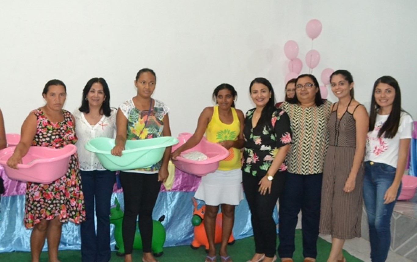 Logo após as brincadeiras e rodas de conversas, a secretária de Saúde, Isamária, juntamente com a secretária de Assistência Social, Claudicéia Feitosa, e demais profissionais, entregaram para as gestantes os kits de enxoval – banheira, toalhas, sabonete, roupa e repelente para combate ao zika vírus.