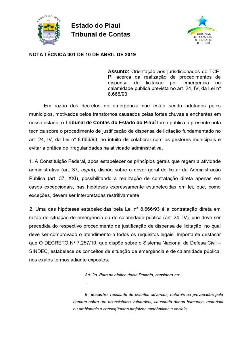O Pleno do Tribunal de Contas do Estado do Piauí (TCE-PI) aprovou, por unanimidade, a Nota Técnica elaborada pela Diretoria de Fiscalização da Administração Municipal (DFAM) com orientações aos prefeitos sobre a abrangência dos decretos de emergência que estão sendo adotados em virtude dos transtornos causados pelas fortes chuvas e pelas enchentes no Piauí.