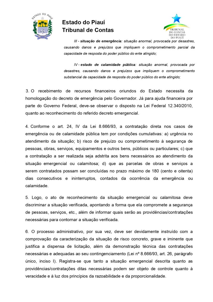 Também é orientado que o ato de reconhecimento da situação emergencial ou calamitosa deve discriminar a situação verificada, apontando a forma que ela compromete a segurança de pessoas, serviços, além de informar quais serão as providências/contratações necessárias para contornar a situação verificada.