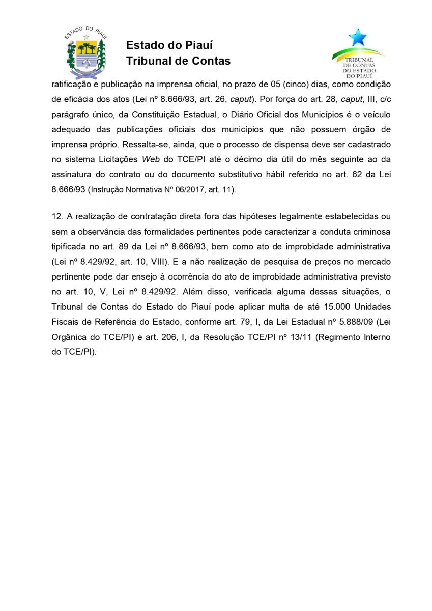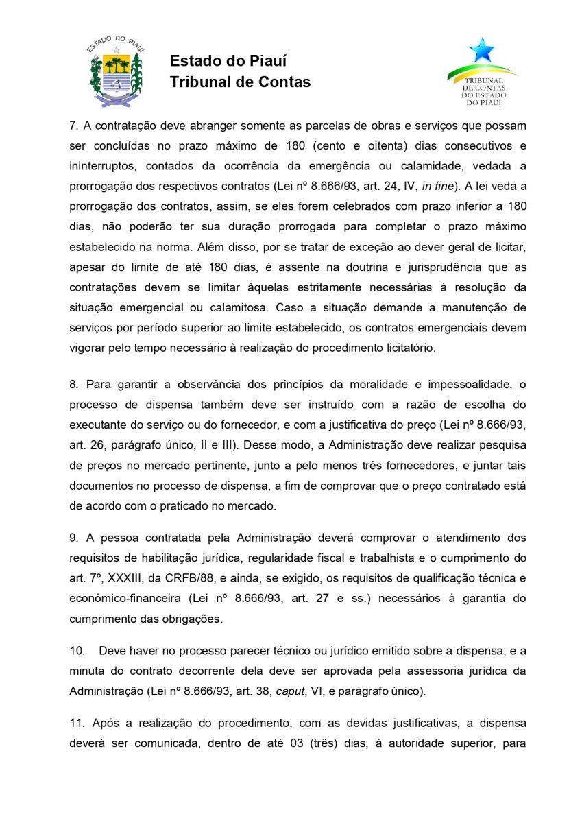 O documento diz, por exemplo, que a contratação direta nos casos de emergência ou de calamidade pública tem por condições cumulativas: a) urgência no atendimento da situação; b) risco de prejuízo ou comprometimento à segurança de pessoas, obras, serviços, equipamentos e outros bens, públicos ou particulares; c) que a contratação a ser realizada seja adstrita aos bens necessários ao atendimento da situação emergencial ou calamitosa; d) que as parcelas de obras e serviços a serem contratados possam ser concluídas no prazo máximo de 180 (cento e oitenta) dias consecutivos e ininterruptos, contados da ocorrência da emergência ou calamidade.
