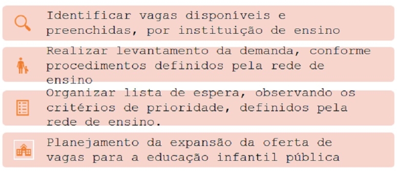 Entre as ações recomendadas, estão a coleta de dados sobre a falta de vagas em creches e a transparência das informações a respeito da lista de espera. Nesse sentido, indica-se a adoção de critérios para priorização do atendimento considerando aspectos de equidade tanto na perspectiva de situações de vulnerabilidade social, quanto das necessidades específicas das crianças.